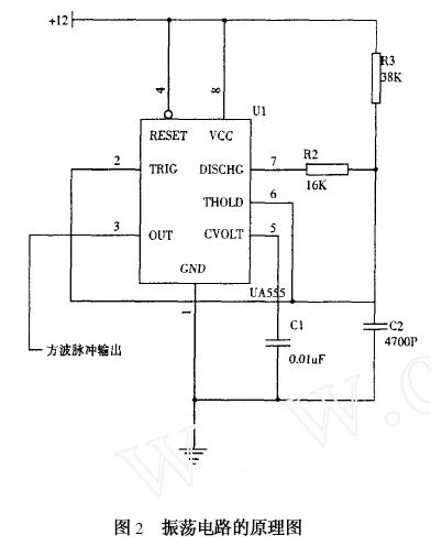振蕩電路的原理圖如圖2所示,電路采用555定時器接成的多諧振蕩器來產生所需一定大小的方波信號。從圖中可以看到:R2、R3、C2是振蕩電路的定時元件,調節它們可以得到不同的振蕩頻率;C1的作用是防止干擾電壓對電路的影響。