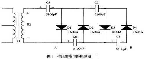 它是由高壓整流堆D1、D2、D3、D4及倍壓電容C5、C6、C7、C8構成的四倍壓整流電路。