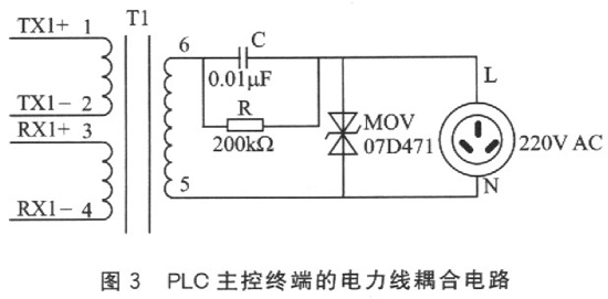 要想通過220 V的家用電力線來傳輸數(shù)據(jù),必須采取合適的耦合方式。在設(shè)計(jì)電力線的耦合方式時(shí),須考慮到電力線通信環(huán)境的特殊性,同時(shí)要考慮到電力線的阻抗較低,一般為幾十Ω。圖3為PLC主控終端的電力線耦合電路,其中TXl+和TXl-用于連接圖2中的驅(qū)動(dòng)電路,是INT5200的電力數(shù)據(jù)信息發(fā)送端;RXl+和RX1-用于連接圖2中濾波保護(hù)電路,是INT5200的電力數(shù)據(jù)信息接收端。在相線和中線之間并聯(lián)一個(gè)壓敏電阻器MOV(07D471),可以防止電力線上的浪涌,避免系統(tǒng)受到損害。電容C和耦合變壓器的次級(jí)構(gòu)成高通濾波器,可以讓電力數(shù)據(jù)信息通過,阻止交流電源的低頻信號(hào)通過。當(dāng)設(shè)備從電力線上脫離時(shí),電阻R可以用來釋放電容器中的能量。