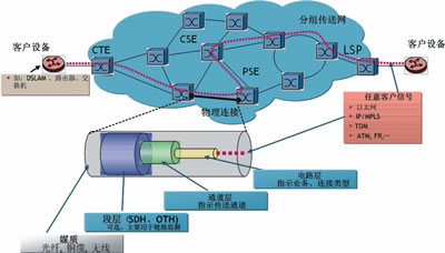 以圖為例,T-MPLS利用網絡管理系統或者動態的控制平面(GMPLS)建立雙向標簽轉發路徑(LSP),包括電路層和通道層、電路層仿真客戶信號的特征并指示連接特征,通道層指示分組轉發的隧道。