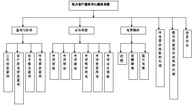 給用戶提供一個(gè)電話語音界面,用戶電話打入系統(tǒng)后,能夠在系統(tǒng)提示語的引導(dǎo)下進(jìn)行自助式服務(wù),亦可轉(zhuǎn)人工服務(wù)。如電話打入系統(tǒng)后,立即得到一個(gè)響應(yīng):“您好!電力系統(tǒng)客戶服務(wù)中心,故障申報(bào)請(qǐng)按1,業(yè)務(wù)受理請(qǐng)按2,投訴申報(bào)請(qǐng)按3,業(yè)務(wù)咨詢請(qǐng)按4,電費(fèi)查詢請(qǐng)按5,轉(zhuǎn)人工服務(wù)請(qǐng)按0”用戶選擇相應(yīng)的語音菜單,獲取相應(yīng)的服務(wù)。電力客服應(yīng)包括以下幾大類功能:查詢與咨詢服務(wù),業(yè)務(wù)受理服務(wù),收費(fèi)、提醒繳費(fèi)和催繳電費(fèi)的服務(wù),停電事故報(bào)修和處理,服務(wù)質(zhì)量投訴舉報(bào)和處理,信息發(fā)布,服務(wù)分類統(tǒng)計(jì)和分析,服務(wù)質(zhì)量的監(jiān)控和考核。參見下圖所示: