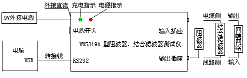 測量方法非常簡單,按圖(1)所示,用同軸電纜線連接被測設備,用RS232通信電纜連接筆記本電腦USB口或COM口;打開軟件,按照提示操作就行了。