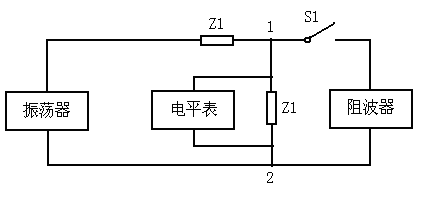 測量阻波器分流損耗的原理圖如圖(2),Z1為線路特性阻抗的等效電阻,如為400Ω,振蕩器輸出+6dB信號,電平表在1-2 處測得的電平為0dB,合上S1由于阻波器的分流,電平表的指示會減小,減小值就是分流損耗,改變頻率就可以直接顯示阻波器分流損耗的曲線。