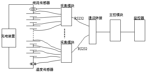 在電力系統變電站目前使用較多的蓄電池在線監測裝置是電池巡檢儀,電池巡檢儀又分為兩種,一種是測量蓄電池單體電壓的巡檢儀,結構是由一個主控模塊和數個采集模塊組成,主模塊接收監控器的命令,發送電池數據到直流設備的監控器;采集模塊中每個模塊采集10~20節電池的電壓、電流和溫度;通過直流充電設備的監控器可顯示各單節電池電壓,判斷故障電池的編號且給出報警。這類電池巡監儀一般由直流設備生產廠家提供,在訂貨直流設備時它是選配裝置,由于功能單一、不能測試容量、且測量精度差、容易誤報,限制了它的廣泛使用。測試示意圖如圖1: