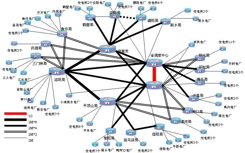 河南電力調度數據專用網絡的各核心層之間采用8X2M方式連接,核心層與骨干層以及骨干層與骨干層之間采用4X2M方式連接,接入層采用2M或2X2M方式連接。