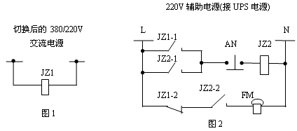 自動(dòng)化設(shè)備的三相380V或220V的交流電源輸入端,220V的單相交流電源直接接在UPS不間斷電源的輸出端。當(dāng)交流主電源正常時(shí),中間繼電裝置線圈帶電,其接點(diǎn)JZ1-1閉合,JZ1-2斷開,220V輔助電源經(jīng)過JZ1-1至閉合的按鈕AN使JZ2的線圈帶電,其接點(diǎn)JZ2-1閉合,JZ2-2閉合。由于JZ1-2是常閉接點(diǎn),在交流主