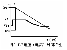 TVS的正向特性與普通二極管相同,反向特性為典型的PN結雪崩器件。圖2是TVS的電流—時間和電壓—時間曲線。在浪涌電壓的作用下,TVS兩極間的電壓由額定反向關斷電壓