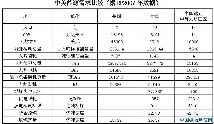 美國2007年3億人口,GDP總額約為13.98萬億美元,能源消耗總量2361.4百萬噸標準油當量,人均7.87噸,用電量4367.875TWh;中國是13億人口,GDP 3.01萬億美元, 消耗1863.44百萬噸標準油當量,人均1.43噸,用電量3277.72 TWh。如果以此線性增長,中國人均達到1萬美元,屆時14億人口將達到14萬億美元GDP時,中國的用電量將達到15245.2 TWh,是美國2007年水平的3.5倍,需要近33.6億千瓦的電力裝機容量。如果延續目前模式,70%的電力將靠燃煤大火電保障,即便全部采用了超超臨界技術,也需要近30億噸標準煤,折合超過42億噸的原煤。如若70%的煤炭用于電力用于發電,屆時需要生產原煤60億噸,而2007年全球的煤炭產量僅有64億噸。