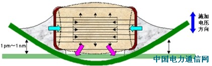 由于陶瓷的強介電性引起的壓電效應,疊層電容在施加交流電之后會向疊層的方向發生伸縮。這是因為介電體一般的泊松比(橫向變形系數)為0.3,如圖2中所示,與疊層方向垂直的方向,即與電路板平行的方向也會發生伸縮,結果導致電路板表面產生振動并能夠聽到聲音。電容器以及電路板的振幅僅為1pm~1nm,但振動聲音已足夠大到我們可以聽見。單個電容器與空氣產生的聲阻抗有所差別,因此若僅是這樣的話應該幾乎是聽不到嘯叫的,然而焊接到電路板上之后,電路板成了聲阻抗變壓器,使振動頻率達到人耳可分辨頻段(20Hz~20kHz)時,就會聽到類似“嘰”的聲音。