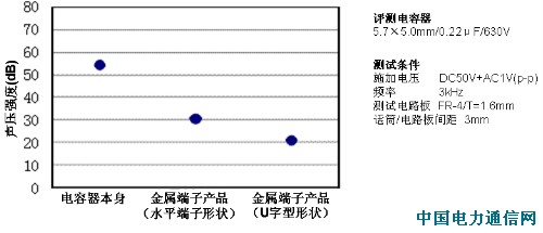 圖5中顯示了嘯叫強度的比較數據。村田制作所擁有聲壓強度測定系統,用于安穩地測定安裝有電容器的的嘯叫強度,通過此系統可以對電容器的嘯叫進行定量測試。