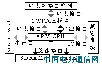 交換機(jī)的硬件主要由CPU模塊和交換模塊組成,如圖2所示。CPU采用基于ARM內(nèi)核的32位嵌入式處理器,實(shí)現(xiàn)交換機(jī)的基本功能配置和故障監(jiān)測(cè)以及對(duì)交換機(jī)的遠(yuǎn)程管理。SDRAM和FLASH采用高性能的芯片,實(shí)現(xiàn)交換機(jī)中程序和數(shù)據(jù)的存儲(chǔ)管理。交換芯片采用國際著名交換芯片公司的工業(yè)級(jí)高速芯片,實(shí)現(xiàn)交換機(jī)的核心功能。