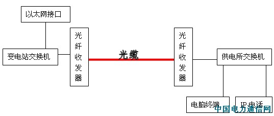 經(jīng)過此次事故以后,我們對供電所和變電站之間的網(wǎng)絡(luò)傳輸采取了一些措施:在供電所和變電站之間增加一對光纖收發(fā)器,在站所之間敷設(shè)光纜來代替原有的網(wǎng)線。如下圖所示:
