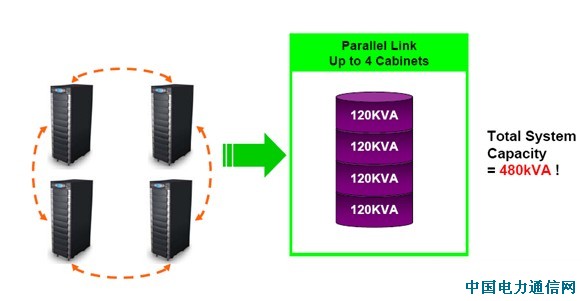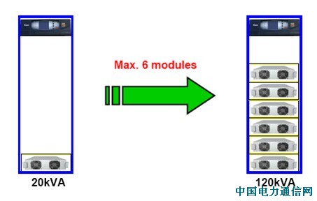 HIFT(海福)UPS因采用模塊化結構,可以在20kVA到480kVA的寬廣范圍內,以20kVA為單位來隨時隨需在線擴容,客戶不再需要僅是為未來的可能性而提前投入大筆費用。(見下圖)