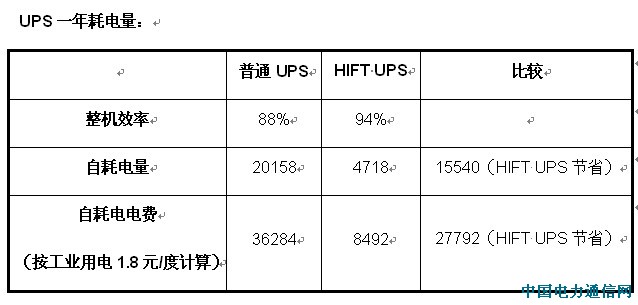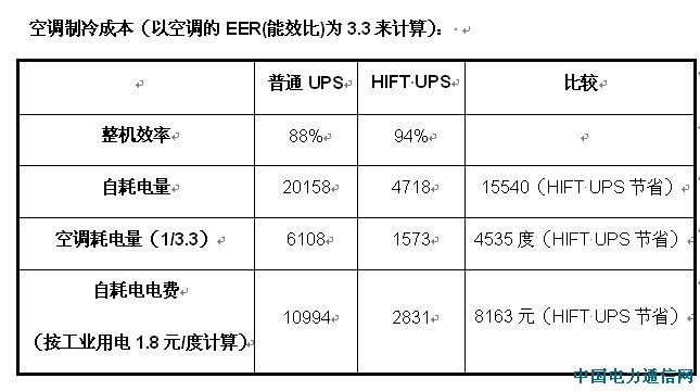 根據上述計算,采用HIFT UPS與普通UPS相比較,僅從電費這一項上來計算,