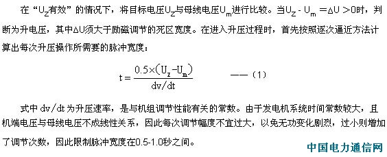 在下發(fā)升壓脈沖之前,還需要進(jìn)一步檢查相關(guān)的約束是否滿足,例如發(fā)電機(jī)端電壓限制、發(fā)電機(jī)轉(zhuǎn)子電流限制、交流勵磁機(jī)勵磁電流的限制、定子電流的限制等。主要約束條件具有冗余,例如發(fā)電機(jī)轉(zhuǎn)子電流限制,交流勵磁機(jī)勵磁電流的限制這兩個(gè)條件,雖然取自不同位置,但都能反映發(fā)電機(jī)勵磁水平。任何一個(gè)測量不準(zhǔn)或者測量回路斷線,都不會導(dǎo)致增減磁失去限制。此外,在升壓過程中如果系統(tǒng)無功缺額大,仍有可能在機(jī)端電壓上升不多的情況下,發(fā)電機(jī)無功變化很快,因此在無功變化速率超過預(yù)期時(shí),將終止本次升壓操作。