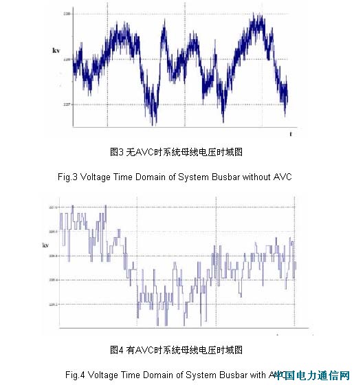 通過對圖3和圖4的對比分析得到以下結(jié)論:1、未投AVC調(diào)節(jié)時(shí)系統(tǒng)線路電壓波動約為2KV,投運(yùn)AVC后系統(tǒng)線路電壓明顯減小,僅為1KV,波動幅值相應(yīng)減小50%,2、投運(yùn)AVC后的系統(tǒng)線路電壓波動的頻率明顯減小,提高了供電電壓品質(zhì)。