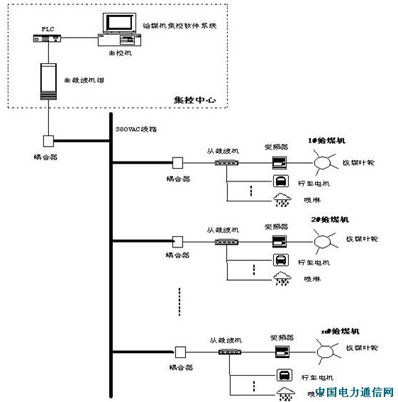電力線載波通訊系統(tǒng)主要由給煤機(jī)、控制箱(帶PLC控制器)、變頻電機(jī)、電力線載波裝置、主控PLC及控制軟件等組成。