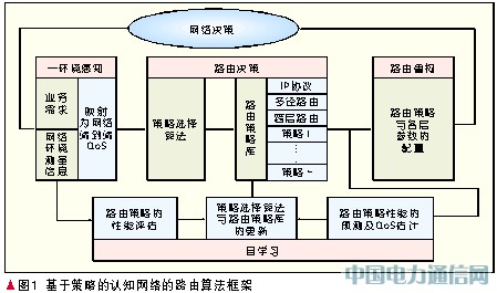 針對(duì)復(fù)雜的網(wǎng)絡(luò)環(huán)境,如何適應(yīng)環(huán)境,充分利用鏈路資源、網(wǎng)絡(luò)資源、用戶(hù)資源,獲得端到端的優(yōu)化目標(biāo)是路由算法需要解決的問(wèn)題。依據(jù)認(rèn)知網(wǎng)絡(luò)的定義,我們給出了基于策略的認(rèn)知網(wǎng)絡(luò)的路由算法框架,如圖1所示。該框架包括如下幾個(gè)功能模塊。