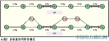 路由策略庫(kù)可以包含常規(guī)的路由協(xié)議,如IP協(xié)議。亦可設(shè)計(jì)一些適于異構(gòu)網(wǎng)絡(luò)環(huán)境的新型路由協(xié)議,如適應(yīng)新物理層技術(shù)MIMO的路由算法,支持鏈路協(xié)同、網(wǎng)絡(luò)協(xié)同的跨層路由算法[6]。圖2給出了一種自組織網(wǎng)絡(luò)中的鏈路協(xié)同方案。在自組織網(wǎng)絡(luò)的任意兩個(gè)節(jié)點(diǎn)之間,多跳鏈路可組成端到端的多信道“協(xié)同路徑”。在圖2(a)中,同路徑上的相鄰鏈路配置了不同的信道,當(dāng)節(jié)點(diǎn)以半雙工模式協(xié)同工作時(shí),鏈路A-B、C-D與E-F或鏈路B-C、D-E與F-G可同時(shí)工作,提升了路徑的流量,獲取了“協(xié)同路徑”增益。當(dāng)路徑上的信道配置與路徑附近區(qū)域的信道配置發(fā)生沖突時(shí),可構(gòu)建類(lèi)似圖2(b)所示的協(xié)同路徑,當(dāng)鏈路B-E不能履行路由任務(wù)時(shí),利用中繼節(jié)點(diǎn)R1構(gòu)建備用鏈路,獲取“協(xié)同路徑”增益。