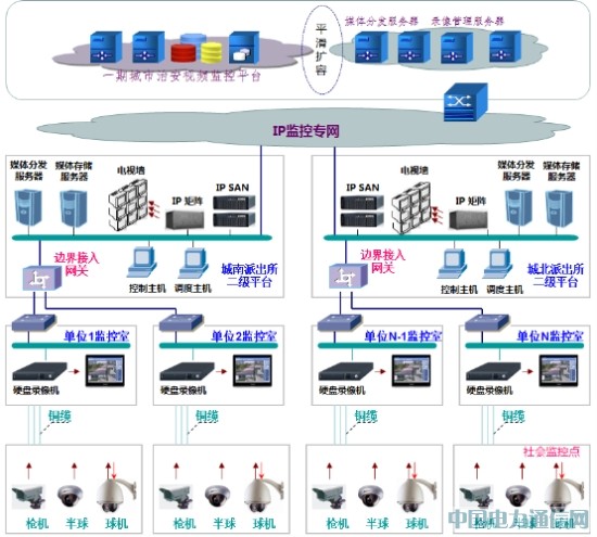 作為第一批開展城市治安視頻監控建設的湖北省某縣,在2008年就開始建設覆蓋全縣交通路口、城市廣場、娛樂場所、網吧、社區等重點治安區域的城市治安動態視頻監控系統,以期有效提高全縣的社會治安管理水平。烽火網絡作為IP視頻監控業務的積極開拓者,全程參與了本次系統工程的建設。系統分為兩期工程逐步實施。