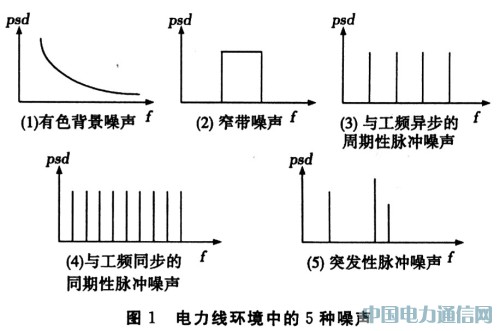 低壓電力線上的噪聲一般劃分為5種類型,其功率譜分別如圖1中所示。