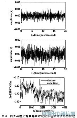 如上所述,背景噪聲包括有色噪聲和窄帶噪聲。背景噪聲的主要特性是低功率的噪聲源,隨頻率的增大而減小,通?杀3謳酌牖驇追昼,有時甚至幾小時不變。其在不同頻段的功率譜密度也隨一定時間保持穩定。又稱為穩態的背景噪聲。通常晚上的背景噪聲比白天大,圖3為白天和晚上所測背景噪聲時域波形與功率譜。