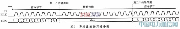 第二階段是數(shù)據(jù)傳輸周期。每個(gè)通訊周期的前8個(gè)SCLK上升沿用來(lái)寫(xiě)AD9857的指令字節(jié),其余的SCLK上升沿是為了通訊周期的第二個(gè)階段,即AD9857和系統(tǒng)控制器間的數(shù)據(jù)傳輸。AD9857的所有數(shù)據(jù)傳輸在SCLK上升沿被寄存,在下降沿被送出。圖2所示是寄存器數(shù)據(jù)寫(xiě)時(shí)序圖。