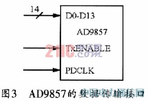 在完成初始化后,AD9857即進(jìn)入正交調(diào)制模式。數(shù)據(jù)通過(guò)14位并行口送入。AD9857的數(shù)據(jù)傳輸接口如圖3所示。