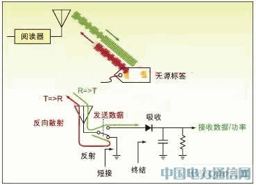 圖1:無(wú)源標(biāo)簽對(duì)射頻 RF能量進(jìn)行整流并調(diào)制信號(hào),然后反向散射反射給閱讀器。