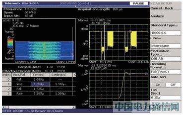 預(yù)編程測(cè)量能減少進(jìn)行這些測(cè)試所需的建立時(shí)間。例如,ISO18000-6 C 類型的一個(gè)重要測(cè)量是啟動(dòng)時(shí)間和關(guān)閉時(shí)間。載波能量上升時(shí)間必須足夠快以保證標(biāo)簽采集到使其正常工作的充足能量。信號(hào)也必須迅速達(dá)到穩(wěn)定狀態(tài)。發(fā)射結(jié)束時(shí),載波能量下降時(shí)間必須足夠快,以防止其他發(fā)射受到干擾 [參閱圖3]。