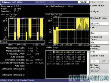 RTSA 也能解調(diào)與標(biāo)簽查詢相關(guān)的符號(hào)或比特。用戶只需選擇相應(yīng)的 RFID 標(biāo)準(zhǔn)、調(diào)制類型和解碼格式。分析儀能自動(dòng)檢測(cè)并顯示鏈路的比特率。為進(jìn)一步提高工程師的生產(chǎn)效率,對(duì)恢復(fù)出的數(shù)據(jù)符號(hào)進(jìn)行了基于功能的顏色編碼(color-coded)。RTSA 能夠自動(dòng)識(shí)別前導(dǎo)符并將那些符號(hào)染成$。這易于識(shí)別實(shí)際的數(shù)據(jù)負(fù)荷并與已知值進(jìn)行比較。