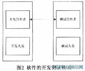 隨著IT技術的發展,傳統的開發人員兼任測試人員的模式已經不能滿足需求,目前大多數較正規的軟件公司均已采用獨立的測試人員來對軟件進行測試,所以形成了開發人員、開發管理者、測試人員、測試管理者的模式。如圖2示。