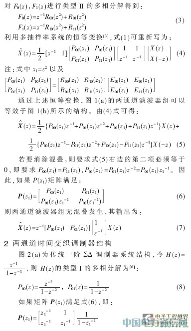 本文從抽樣率變換和濾波器組基本理論出發,通過多抽樣率系統的恒等變換[3,4],推導了兩通道濾波器組無混疊的條件。對傳統ΣΔ調制器結構進行等效變換,得到兩通道時間交織ΣΔ調制器的系統結構,理論上運算速度提高到單通道的2倍[5]。采用SIMULINK對二階兩通道時間交織ΣΔ調制器進行了建模仿真。