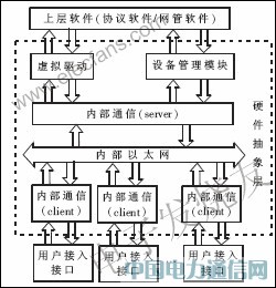 根據文獻提出的方案,高性能路由器硬件抽象層可分為內部通信、虛擬驅動及設備管理三大模塊,這三部分模塊相互配合,共同完成面向實際的用戶設備接口的功能模擬及硬件細節的屏蔽,并對其進行統一協調的管理。硬件抽象層對用戶設備接口的功能模擬主要由虛擬驅動模塊完成,包括數據包的收發及協議報文的預處理等工作,為上層協議軟件提供標準的API函數;而對用戶設備的接口管理則由上層網絡管理軟件通過設備管理模塊對其進行管理配置及監控;內部通信模塊運行于內部以太網絡,協調各模塊之間的功能接口,保證各從處理單元與主處理單元之間實時可靠的數據傳輸。其基本結構如圖1所示。