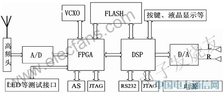 根據(jù)對DAB接收機組成部分的分析,本次設計采用FPGA+DSP的設計方案,DAB接收機完整的結構框圖如圖2所示。DAB信號從天線接收后進入高頻頭部分,選出所需的頻率塊,然后將選出的高頻信號送入混頻器,變?yōu)橹行念l率為38.912MHz、帶寬為1.536 MHz的中頻信號,中頻信號濾掉無用的頻譜部分后再經(jīng)頻率變換和濾波,變?yōu)橹行念l率為2.048 MHz、帶寬為1.536MHz的基帶信號。然后進入ADC,采樣速率為8.192MHz,轉換成數(shù)字信號后進入FPGA。FPGA完成并串轉換,同步和解調(diào), 以及VCXO所需的控制電路等。處理后的數(shù)據(jù)進入DSP,DSP外部時鐘為24.5MHz,所以DSP可進行4倍頻,工作于100MHz。DSP中完成解交織、Viterbi譯碼、解擾以及音頻解碼,最后數(shù)據(jù)被送入DAC,恢復出原始模擬信號,送入喇叭即可收聽。