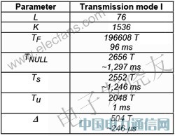 歐洲DAB系統(tǒng)規(guī)定了4種模式,本設計采用的是第1種模式,具體參數(shù)如表1所示。其中,L表示一幀的符號數(shù),K表示每個符號的子載波個數(shù),TF表示一幀的持續(xù)時間,TNULL表示空符號持續(xù)時間,Ts表示每個符號的持續(xù)時間,Tu表示有效符號的持續(xù)時間,Δ表示保護間隔的持續(xù)時間。