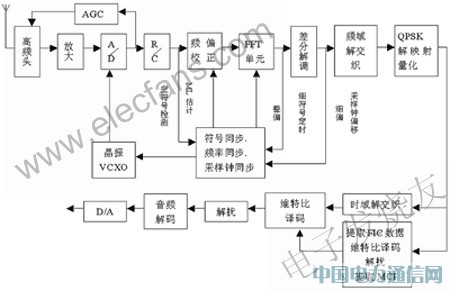 DAB接收機原理框圖如圖1所示。DAB接收機將從天線接收到的信號經(jīng)過高頻頭轉為中頻模擬信號,放大后進行A/D變換,得到數(shù)字信號。其中A/D采樣時鐘受晶振VCXO的控制,采樣時鐘偏移由采樣時鐘同步部分估計得到。A/D轉換后的數(shù)據(jù)一路做AGC檢測去控制高頻頭的輸出,另一路經(jīng)過R/C變換成FFT所需要的兩路實虛部數(shù)據(jù)信號。時間同步部分估計得到一個時域符號的同步頭,并粗略地估計由于收發(fā)頻率不一致而引起的頻偏。經(jīng)過FFT變換后,頻率同步單元定出FFT的窗口位置,校正帶有頻偏的數(shù)據(jù)。校正后的數(shù)據(jù)經(jīng)過信道估計,得到當前實時的信道響應,經(jīng)過信道均衡處理以消除信道多徑衰落的影響,然后再經(jīng)過解映射軟判決譯碼和解擾,然后將音頻信號送入信道解碼器解碼,接著進行信源解碼和音頻綜合,最后經(jīng)D/A還原成模擬音頻?