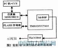 OQPSK調制器的硬件開發平臺采用的是合眾達的SEED-DEC5416嵌入式DSP開發板,其系統結構原理如圖2所示。處理器是16bit定點DSP芯片TMS320VC5416,OQPSK信號的16位各樣點數據送往轉換精度只有14位的D/A轉換控制器TLC32044,該控制器只對16位中的高14位數據進行D/A轉換,轉換后的波形送示波器顯示。