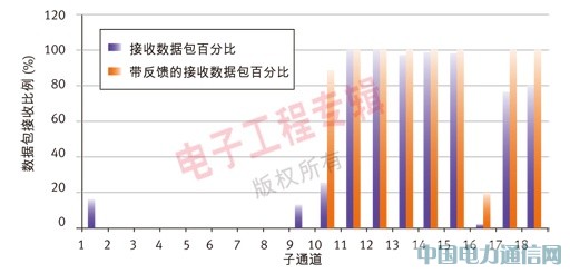 圖2呈現(xiàn)的,是采用OFDMA的冗余策略。與現(xiàn)有電力線通信方案相比,這種方法抵抗噪聲的能力提高了18db。從圖2可以看出,盡管有一半通道因?yàn)樵肼暥枞杂辛硪话霐?shù)量的通道可以正常工作,從而保證了100%的數(shù)據(jù)傳輸?shù)诌_(dá)率。所以,OFDMA可以顯著地提高數(shù)據(jù)吞吐量,同時也可以顯著提高可靠性。