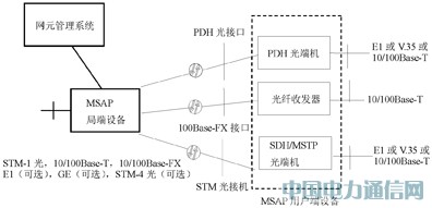 MSAP系統通過SDH接口或以太網接口與SDH/MSTP傳送網或IP城域網相連;通過E1,10/100BASE-T接口或V.35接口和客戶設備相連。