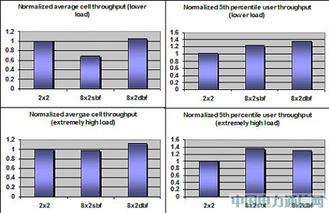 對(duì)于8X2雙流波束賦型而言,同樣,邊界速率要好于2X2 天線MIMO;對(duì)于小區(qū)平均速率,在低負(fù)荷條件下(即LTE網(wǎng)絡(luò)初期部署時(shí)期),2X2 MIMO場(chǎng)景的小區(qū)平均吞吐速率與8X2雙流波束賦型的效果接近。在高負(fù)荷條件下,對(duì)比2X2 MIMO場(chǎng)景,8X2雙流波束賦型的小區(qū)平均吞吐速率會(huì)有一定幅度改善。