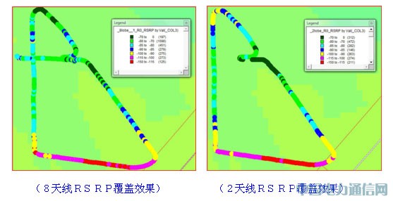 上述測(cè)試中使用的基站天線為常見的型號(hào)。目前市場(chǎng)上在同樣物理尺寸的條件下,8天線的增益要小于2天線2-3dB左右。因而,在部署網(wǎng)絡(luò)中,如果天線高度要求一定,8天線和2天線下行公共信道的覆蓋效果基本是相當(dāng)?shù)摹?/p>