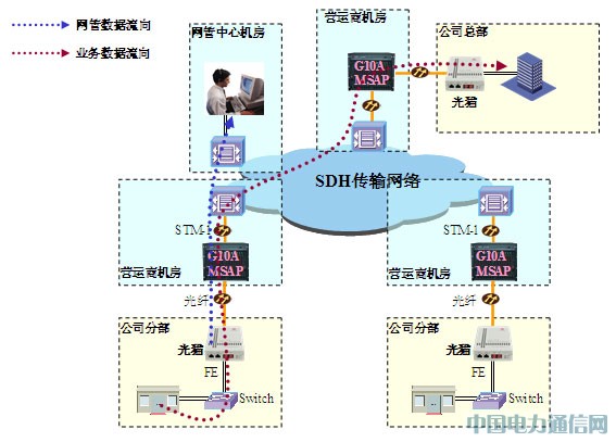 在客戶的末端點(diǎn)(一般是公司的分支機(jī)構(gòu))部署光纖收發(fā)器,將對(duì)接客戶的的數(shù)據(jù)設(shè)備。光纖收發(fā)器通過(guò)光纖與營(yíng)運(yùn)商機(jī)房的G10A型MSAP設(shè)備對(duì)接。在營(yíng)運(yùn)商機(jī)房部署的G10A型MSAP設(shè)備完成分支機(jī)構(gòu)數(shù)據(jù)業(yè)務(wù)的GFP封裝,并將業(yè)務(wù)映射進(jìn)VC容器,進(jìn)入SDH網(wǎng)絡(luò)。在中心點(diǎn)(一般為營(yíng)運(yùn)商中心機(jī)房)部署G10A型MSAP設(shè)備,還原相關(guān)的數(shù)據(jù)業(yè)務(wù),并與公司總部的光纖收發(fā)器對(duì)接,將相關(guān)數(shù)據(jù)業(yè)務(wù)傳送至總部?jī)?nèi)網(wǎng)。