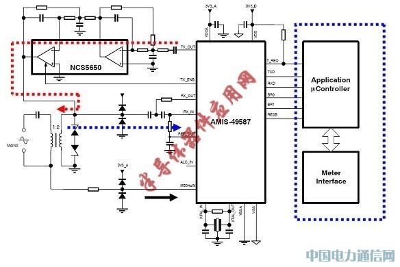 藍色箭頭表示接收路徑。變壓器從電力線耦合過來的信號經AMIS-49587內置放大器構成的低通濾波器由內部ARM進行FSK解調分析。圖中黑色箭頭是 50Hz的過零檢測信號引腳。系統依靠這個信號進行同步定時。圖中藍色虛線內是電表內的應用處理器,負責應用層處理通信及計量。