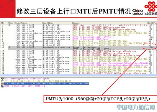 將三層設備上行以太網口默認MTU改為1000字節。抓包結果顯示如下: