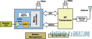 每個(gè)無線傳感器都被看作一個(gè)節(jié)點(diǎn),擁有無線通信能力,同時(shí)還具有一定的信號(hào)處理與網(wǎng)絡(luò)數(shù)據(jù)的智能。根據(jù)應(yīng)用的類型,每個(gè)節(jié)點(diǎn)都可以有一個(gè)指定的地址。圖2顯示了某個(gè)節(jié)點(diǎn)的通用結(jié)構(gòu)圖。它一般會(huì)包括一個(gè)傳感裝置、一個(gè)數(shù)據(jù)處理微控制器,以及一個(gè)無線連接RF模塊。根據(jù)不同的網(wǎng)絡(luò)定義,RF模塊可以起到一個(gè)簡(jiǎn)單發(fā)射器或者收發(fā)器(TX/RX)的作用。進(jìn)行節(jié)點(diǎn)設(shè)計(jì)時(shí),注意電流消耗和處理能力非常的重要。微控制器的內(nèi)存非常依賴于所使用的軟件棧。