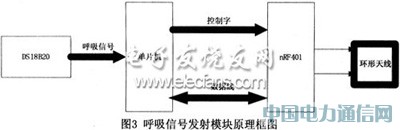 采用的nRF401是一個433MHZ ISM頻段設計的真正單片UHF無線收發芯片,它采用FSK調制解調技術,nRF401最高工作頻率可以達到20k,發射功率可以調整,最大發射功率為+10dBm。利用單片機對發射部分進行設置,通過發射模塊將承載呼吸信號的數字信號發射出去,其原理框圖如圖3所示。