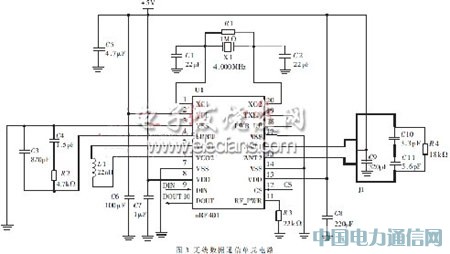 無線數據通信電路主要擔負機動車輛與固定基站系統進行近距離的無線數據交換任務。由核心芯片nRF401及其附屬元件組成。NRF401是雙信道、高性能、低功耗的專用無線通信芯片,工作頻率為433.93/434.33MHz,工作電壓為3.3V,最高通信速率為20kbps,可以直接與單片機串口相接,進行異步通信,實現數據發送和接收,無需對數據進行編碼。數據輸入端DIN與單片機的TXD端相接,數據輸出DOUT端與單片機的RXD端相接。在本電路中,通信速率設計為19.2kbps。電路原理如圖3所示。