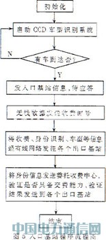 固定系統分為出口基站和入口基站,物理結構基本一樣,功能上有所區別。在入口部分,首先通過CCD對即將進入高速公路的車輛的車型進行驗證,確定收費價位;然后通過無線數據通信系統發出指令,驗證車輛是否具備自動交費系統。在接收到機動車內系統的應答并確定該車具備自動交費功能之后,將車輛特征信息、“身份”驗證信息及該車的自動收費編號通過調制解調器及固定電路網通知各個出站口的收費系統;同時通過無線數據通信傳送到車載系統,以供出站時驗證。在車輛放行后,通過電話網驗證該車是否具備交費能力。如果某個車具備自動交費能力或欠費,各個路口的無線系統都將跟蹤這個車的行蹤,并及時將信息反饋到呼個執勤站點,通過執勤人員強制收費。