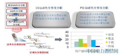 從業務上看, CS域的用戶感知,主要關注點為語音業務、vp業務;PS域上的用戶感知,主要關注點為www業務、ftp業務、IM業務、wap業務。通過對這些業務進行話單級的評分與失分分配,再匯聚成區域級的業務評分與失分要因分配,從而達到從微觀到宏觀,從用戶到網絡的整體優化。